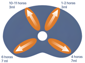 As injeções são sempre feitas após a aspiração e posicionadas "Clockwise" (no sentido horário) de acordo com a anatomia de Clegg em 1, 4, 8 e 11